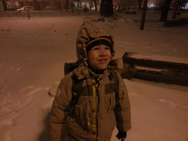 19 декабря снег начался, Мишу со школы забирала, все детей в охапку и быстрее домой. Детки радуются снегу, погулять просятся, обычно гуляют на площадке возле школы после уроков, а тут не-не-не, холодно, быстрее домой. В общем мы с Мишей одни гуляли, снеговика слепили - довольные.