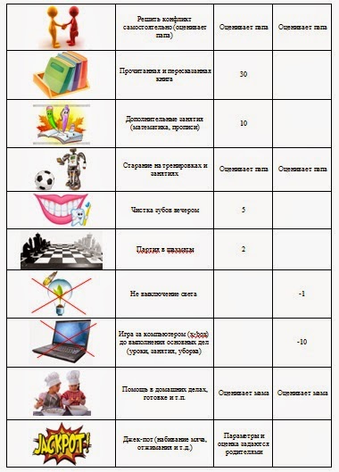Если они выполняют эти обязанности (в том числе уроки) без напоминания, то только в этом случае получают баллы. Если же кто-то из родителей указал, что кровать не заправлена, а одежда валяется по комнате - исправить это нужно, но баллы уже не даются. Одежда так и валяется целый день - баллы отнимаются. За не сделанные уроки баллы не отнимаются, в школе сами будут отвечать, будет стыдно или будет двойка.