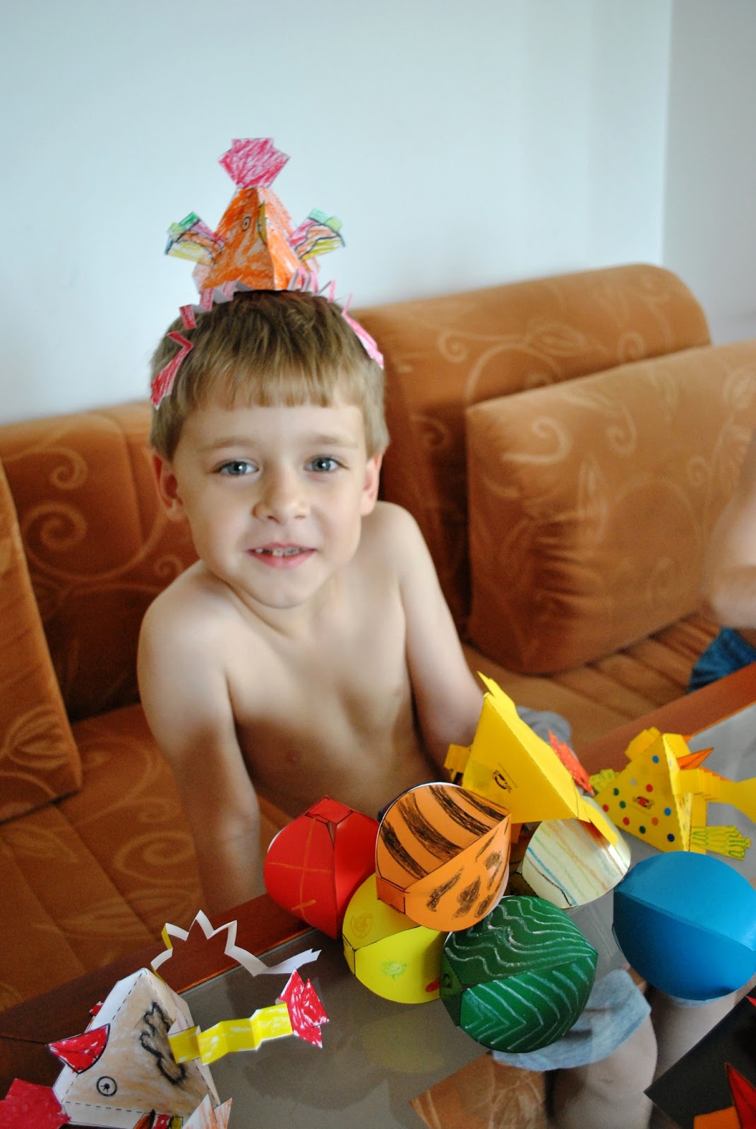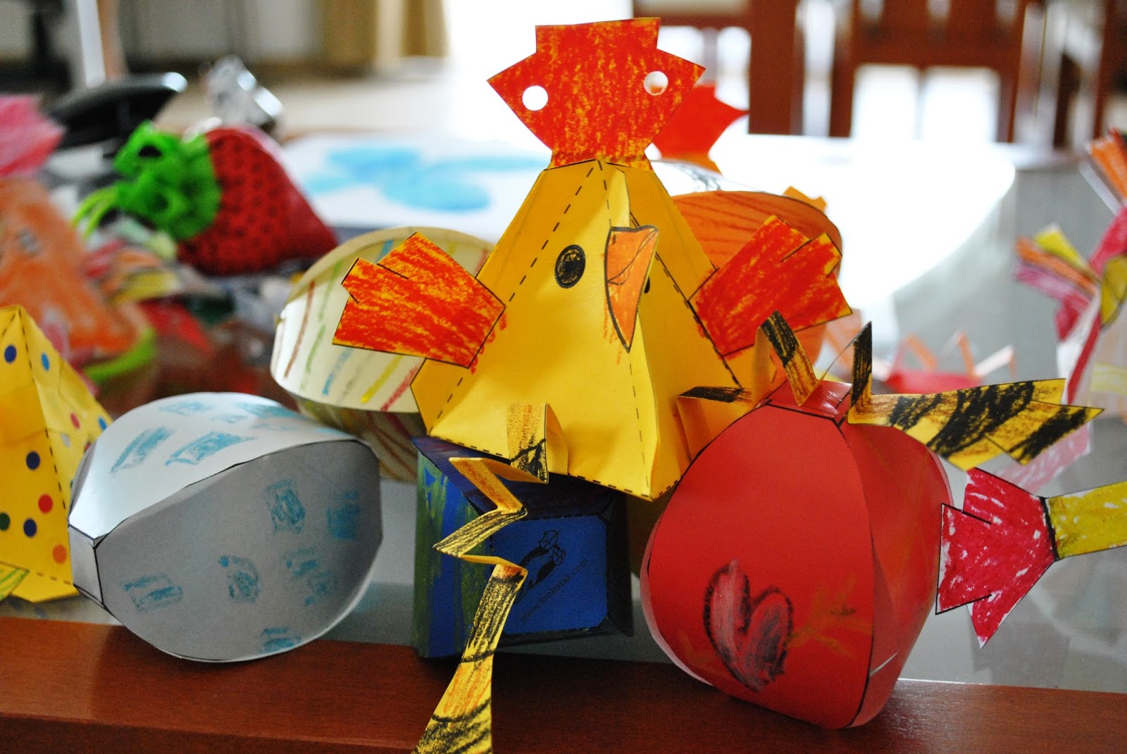 А пока мы красим яйца, делаем разные поделки.Уже почти готова гирлянда их курочек и яичек, мальчишки сопят раскрашивают, режут, клеят.