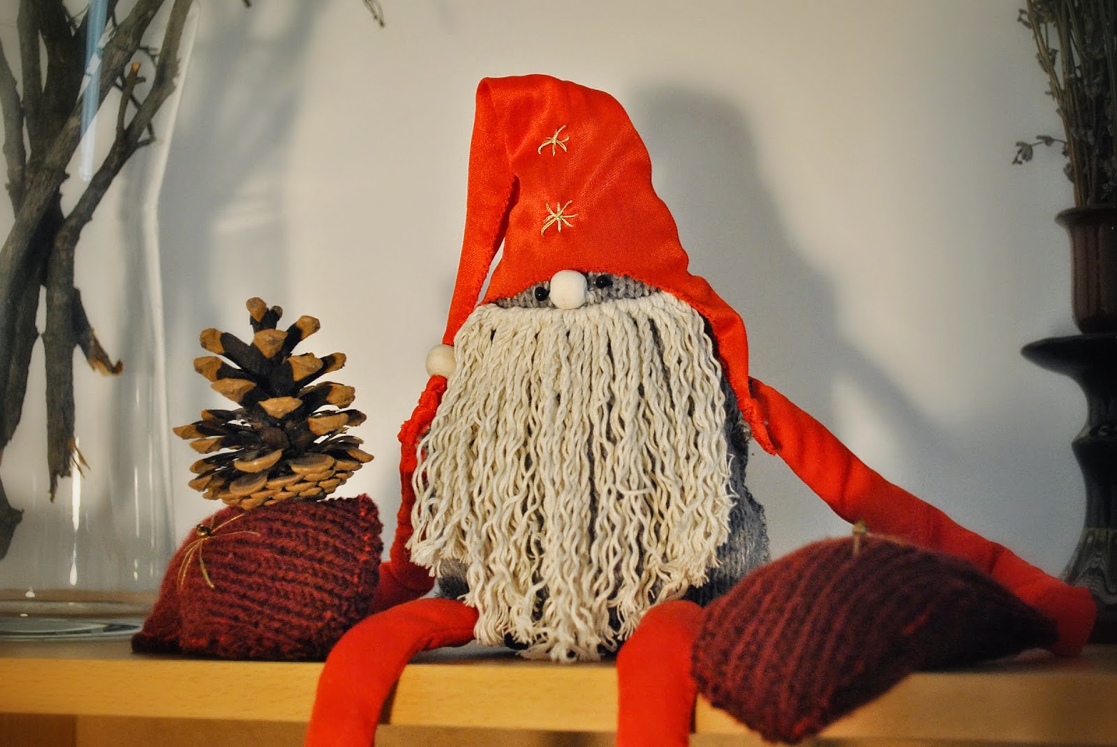 На днях бродили с Мишкой по рождественским отдельчикам, приглянулся нам гном. Его фишка была в длинных руках и рукавичках с утяжелением. За счет этих грузиков гном мог повиснуть где угодно, принимать забавные позы. Купить не купили (дорого как-то), но на ус намотали ))