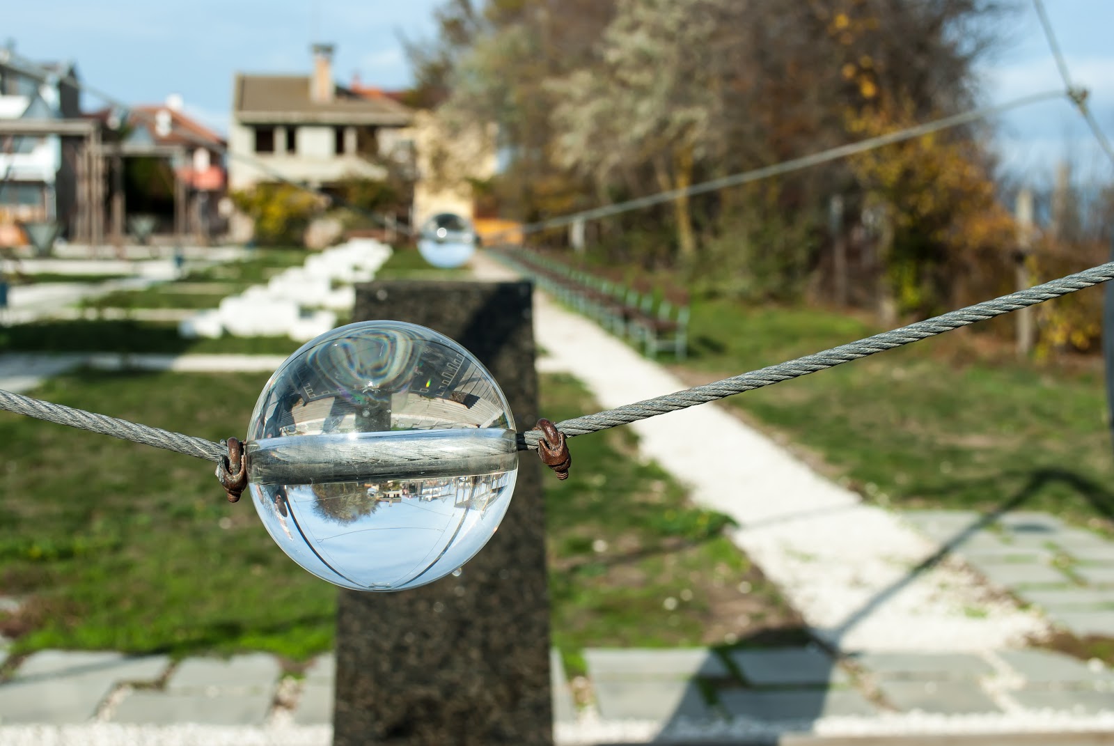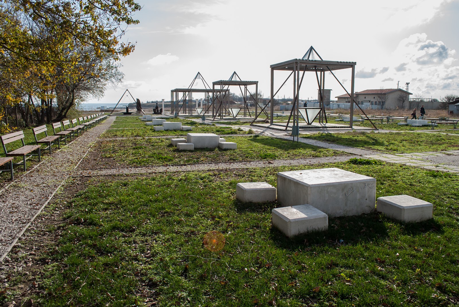 Рядом с маяком расположился современный, весьма занятный парк. Интересен он тем, что в композиции за основу взята символика масонов (пирамиды. колонны, отвесы, шахматный пол). Многих элементов по 4: как 4 стороны света, 4 времени года и т.д.